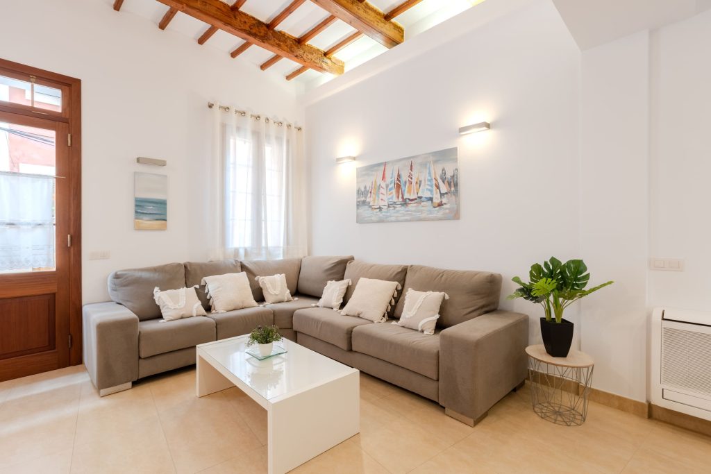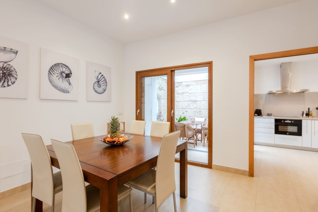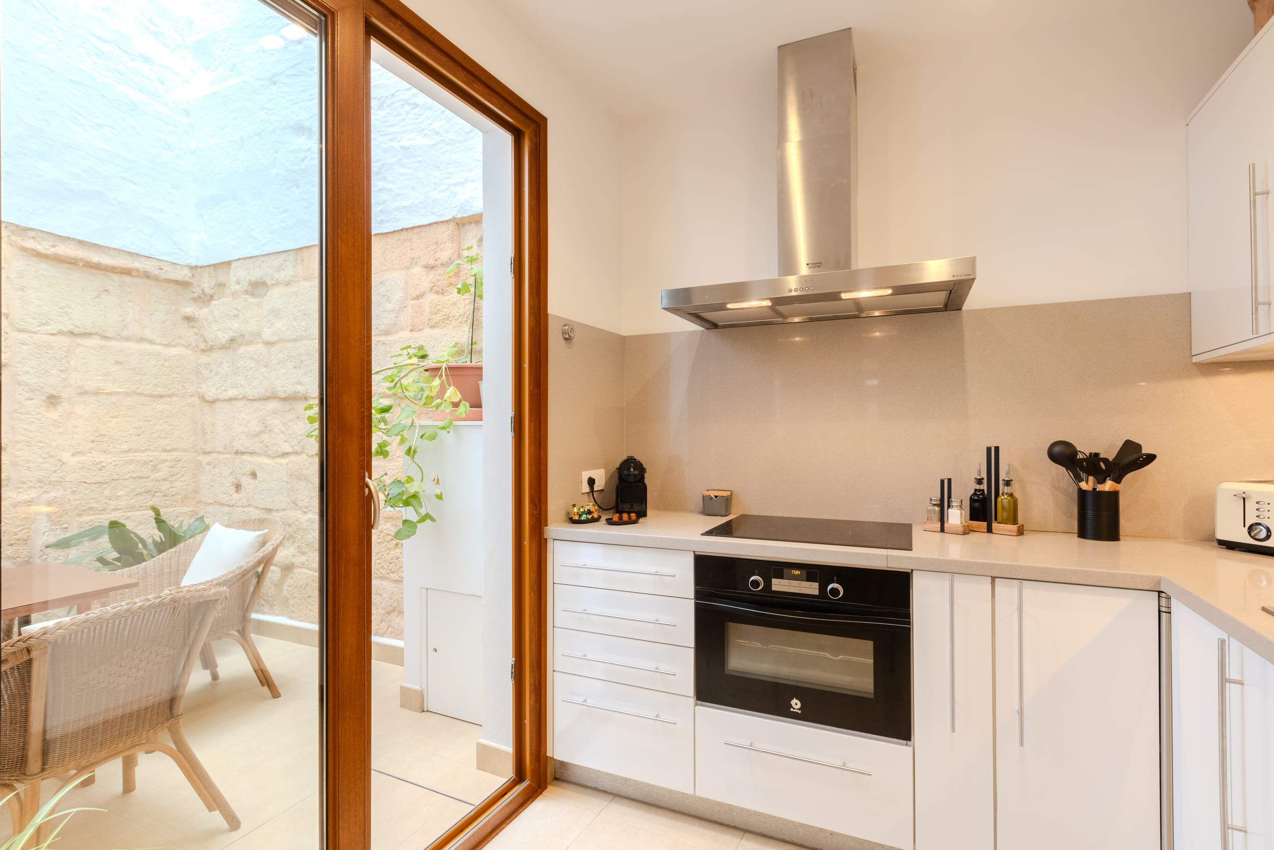 La cocina, moderna y totalmente equipada, dispone de horno, placa de cocción, lavavajillas, nevera, cafetera, tostadora y menaje completo. Desde aquí se accede directamente al patio, facilitando una vida interior–exterior muy característica de las casas menorquinas.